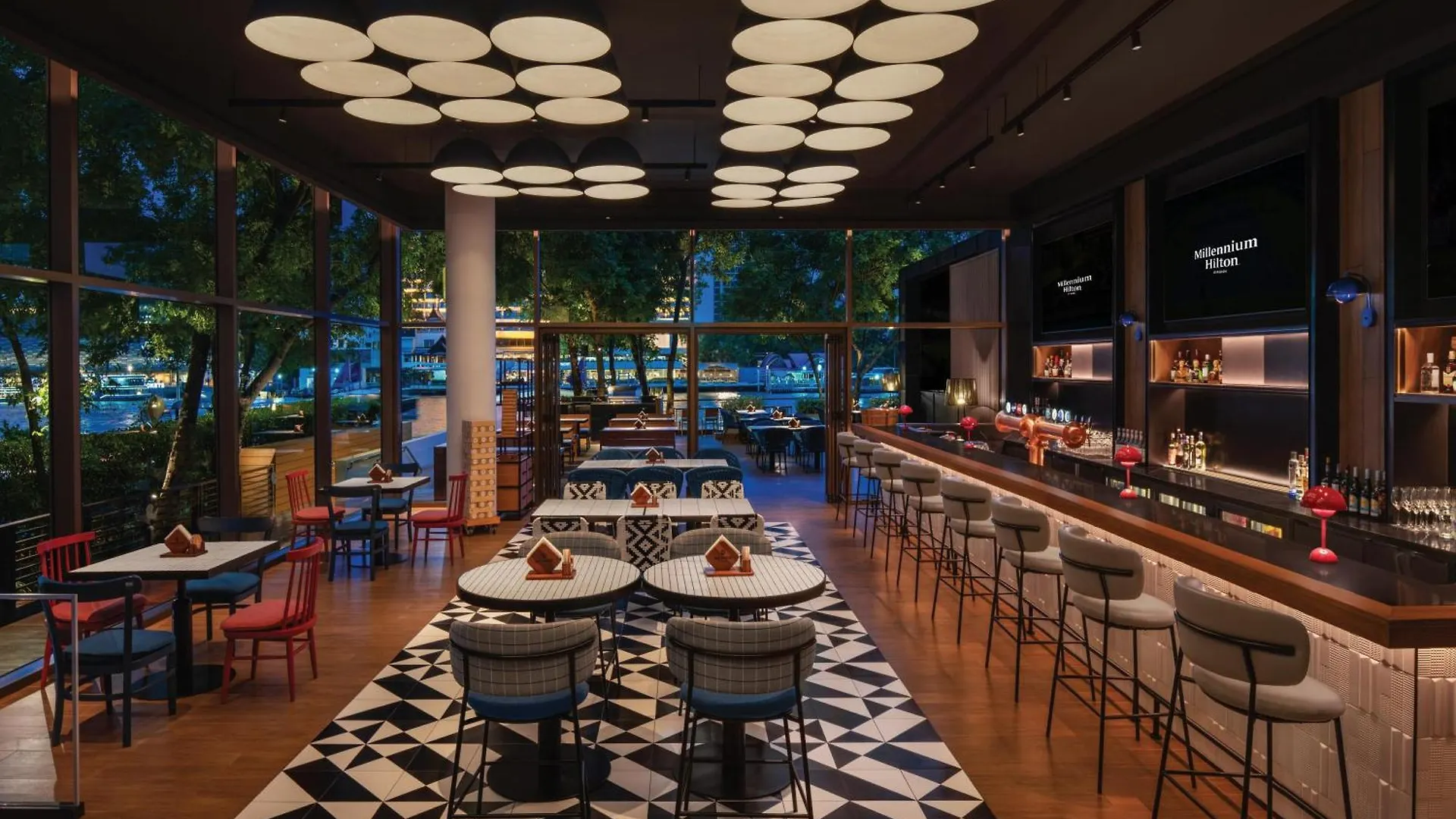 O restaurante Flow olha para o mar e é especializado na cozinha chinesa. Para satisfazer todos os paladares ele oferece uma opção do cardápio vegano. Os hóspedes no o Millennium Hilton Bangkok Hotel podem aproveitar várias opções de jantar disponíveis no jazz bar. A área do bar inclui salão.