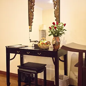 Guest rooms offer views of the garden. The guestrooms have tasteful dark wood furniture.